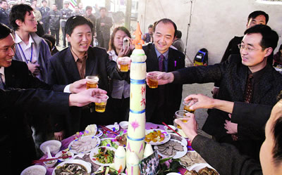 工作人員忙碌地張羅著。記者還發(fā)現(xiàn),在聶家新房前,新壘起了一個(gè)大磚灶,上面架一口大鐵鍋,鍋內(nèi)熱氣騰騰。經(jīng)打聽得知,因擔(dān)心前來(lái)道賀的親友眾多,工作人員特意向當(dāng)?shù)貜N師借來(lái)一口大鍋,用于煮長(zhǎng)壽面。因鍋實(shí)在是太大,聶家沒(méi)有相應(yīng)的灶能架住,于是人們?cè)谇叭瞻頃r(shí)分,臨時(shí)壘了這座灶臺(tái)。慶祝儀式結(jié)束后,記者上前打聽一共向這口大鍋里下了多少面條。兩名幫忙的鄉(xiāng)親說(shuō):“我們不停地在下面條,已經(jīng)記不清到底下了多少了!”他們還告訴記者,在當(dāng)?shù)兀昭缛绱寺≈,天南海北的人如此眾多,如此受到關(guān)注,在楊垱鎮(zhèn)甚至在整個(gè)襄樊市“都應(yīng)該是第一次”。