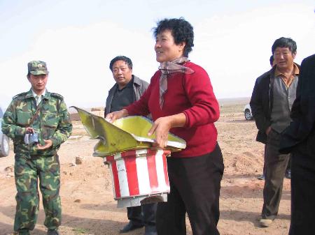 記者在搜索現(xiàn)場(chǎng)看到,從四面八方趕來(lái)的牧民群眾個(gè)個(gè)都有所獲。“哈呀,人們常說(shuō)天上掉餡餅,這不應(yīng)驗(yàn)了?”牧民張金虎指著自己撿到的一堆殘骸,興奮地開(kāi)著玩笑。牧民烏云還向記者炫耀,她和丈夫?yàn)趿裉焯匾馄鹆藗(gè)大早,在家焚香默默祝愿神舟六號(hào)飛船試驗(yàn)成功,所以今天他們撿到的殘骸最多,能裝滿滿一車。