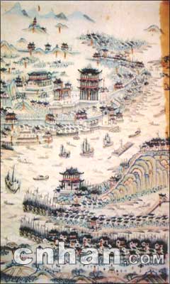 此圖藏于大連市圖書館,手繪彩圖。未標(biāo)明作者姓名和成圖時間,圖中標(biāo)注了武昌、漢口“龍王廟”等。筆者鑒定此圖為清代中期作品,根據(jù)是圖中有“龍王廟”,而龍王齋建于乾隆四年(1739年),故此圖當(dāng)于1739年以后所繪。但圖中沒有出現(xiàn)漢口城堡,而漢口城堡建于1864年,同時圖中只繪有木帆船,而未出現(xiàn)現(xiàn)近代輪船。武漢江面出現(xiàn)航運(yùn)和輪船是1862年以后?芍藞D當(dāng)成于1862年前。可大體界定此圖繪于1739年至1862年之間。