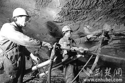 穿著雨衣的工人們手持風(fēng)槍?zhuān)谀_手架上下打爆破眼,山體里的水嘩啦啦直往下噴,然后順著挖好的水槽排向洞外,最多時(shí)一天要排3000立方米!斑@水算小的!”也許是察覺(jué)出我們眼神里的擔(dān)心,包秀峰輕松笑笑,仿佛一切都在他們掌控中。他甚至調(diào)侃說(shuō),“瞧,我們都穿皮鞋上班,施工環(huán)境沒(méi)你們想象中那么艱難。”