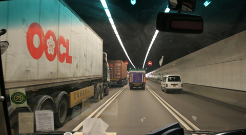 穿流不息的集裝箱貨柜車流通過海底隧道