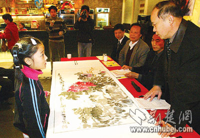 “劉老師,看看我的畫(huà)吧!”9歲的張俁俁是武昌中華路小學(xué)學(xué)生,她第一個(gè)交出自己的牡丹長(zhǎng)卷請(qǐng)老師“檢閱”。陪同前來(lái)的母親吳女士在一旁介紹:“俁俁看到報(bào)紙后就一直惦念這事。今天一早她就起床了,拉著我跟她外婆往這趕!
