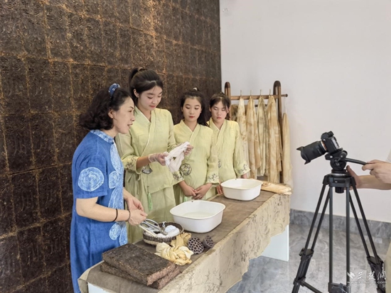 趙愛新(左一)帶領(lǐng)學生在羊樓洞古鎮(zhèn)現(xiàn)場制作茶染作品。通訊員 供圖