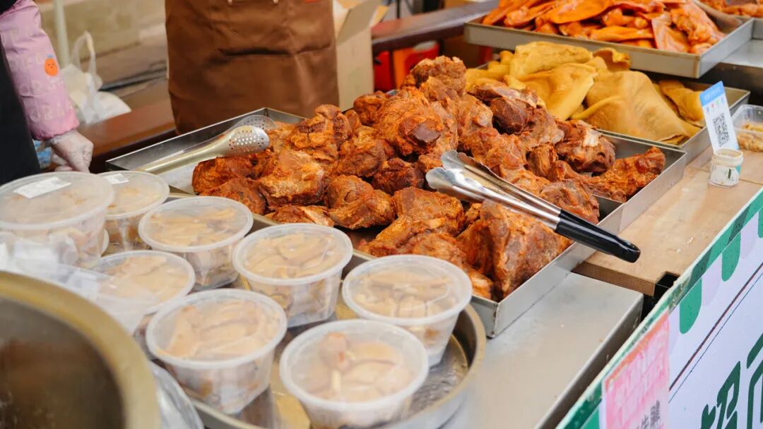作為活動的重要組成部分,特色年貨市集“滿倉吉市”匯集了滿滿的煙火氣與本土特色。黃陂三鮮、鴨子煲、清湯鵝等地道美食香氣四溢,喚醒味蕾記憶。本地農(nóng)產(chǎn)品等特色攤位也一字排開,好不熱鬧。朝陽村的豆絲攤位前早早排起了長隊。朝陽村黨支部書記、村委會主任熊偉介紹:“今天我們準備了200斤米漿,現(xiàn)場制作近千張豆絲免費供游客品嘗,既讓大家嘗到家鄉(xiāng)味,也帶動了村里油、土雞、糯米等農(nóng)副產(chǎn)品的銷售。”