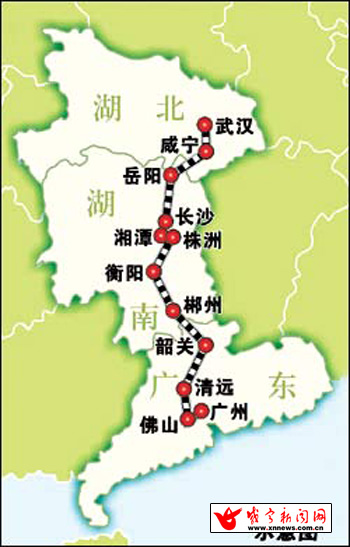 武廣高速鐵路是北起武漢南至廣州的高速鐵路。武廣高速鐵路是我國(guó)高速鐵路網(wǎng)中一條具有戰(zhàn)略意義的南北大動(dòng)脈,對(duì)緩解南北交通壓力具有無(wú)法替代的作用,不僅為中部及西部?jī)?nèi)陸省份提供了便捷的出海通道,而且還將對(duì)中部地區(qū)乃至全國(guó)的經(jīng)濟(jì)發(fā)展帶來(lái)新的動(dòng)力。