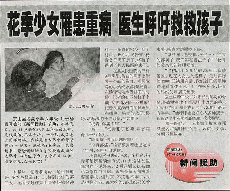 京山縣一對(duì)先后患上急性白血病的少女,妹妹已于一年前不幸夭折,姐姐楊青在死亡線上苦苦掙扎。父母為治療姐妹倆的病,花光了所有積蓄,仍不能湊夠移植骨髓所需的幾十萬元手術(shù)和治療費(fèi)用,已經(jīng)陷入絕望。但是,才14歲的楊青不肯向悲慘的命運(yùn)妥協(xié),她寫信給報(bào)社:“我不想死,我要讀書,救救我吧!”